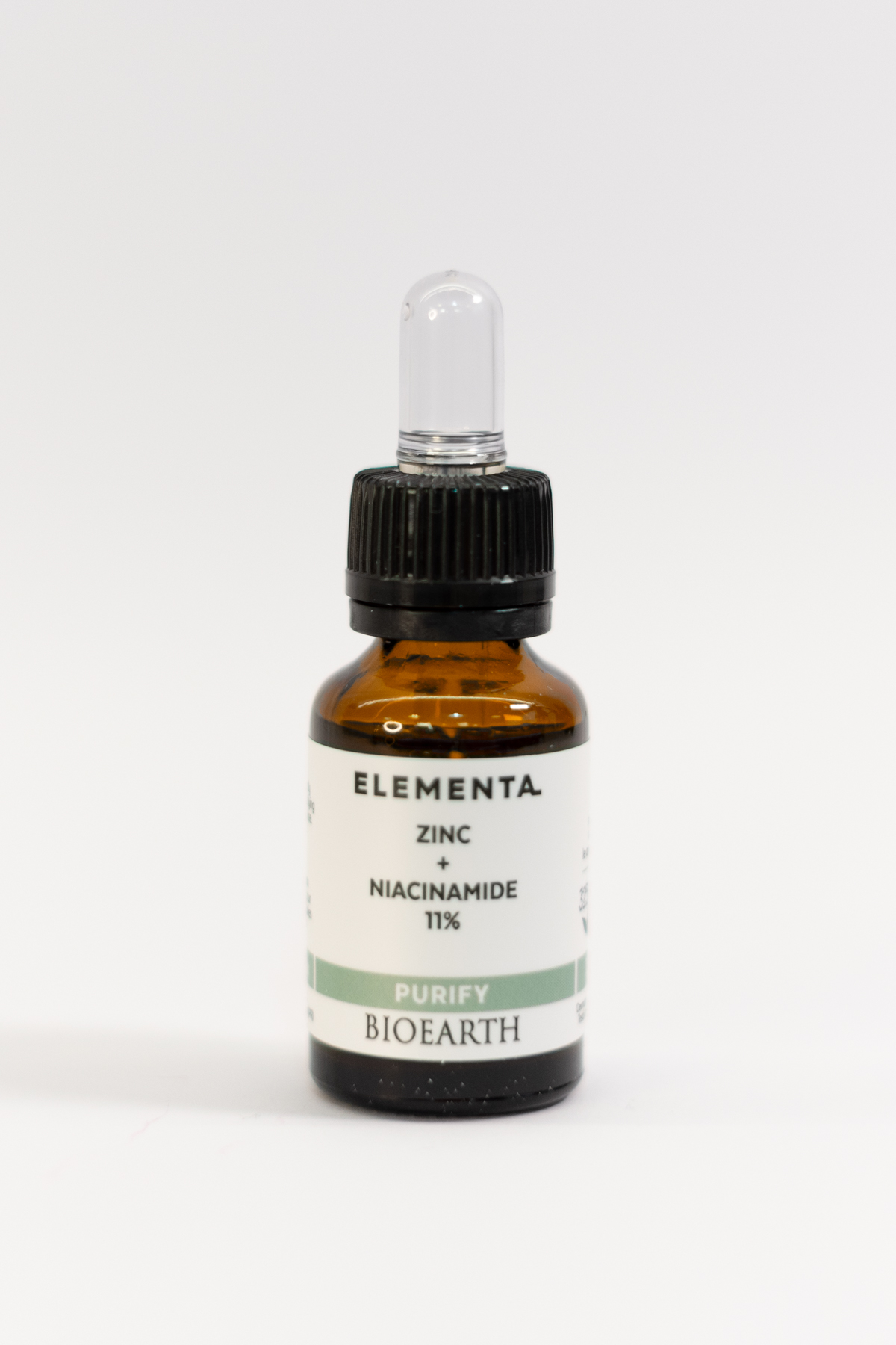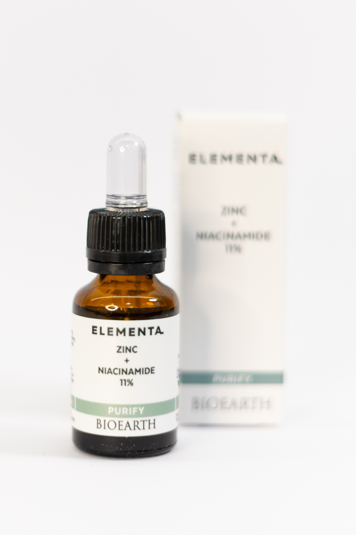 El sérum Elementa Purify Zinc + Niacinamide 11% de Bioearth es una solución concentrada que combina niacinamida y zinc en una base activa de jugo de aloe vera y ácido hialurónico. La niacinamida es conocida por sus propiedades hidratantes, reguladoras del sebo y aclaradoras de la piel, mientras que el zinc posee efectos normalizantes y es utilizado para tratar imperfecciones y acné en pieles jóvenes. Este producto es apto para pieles grasas, mixtas o con tendencia acneica.